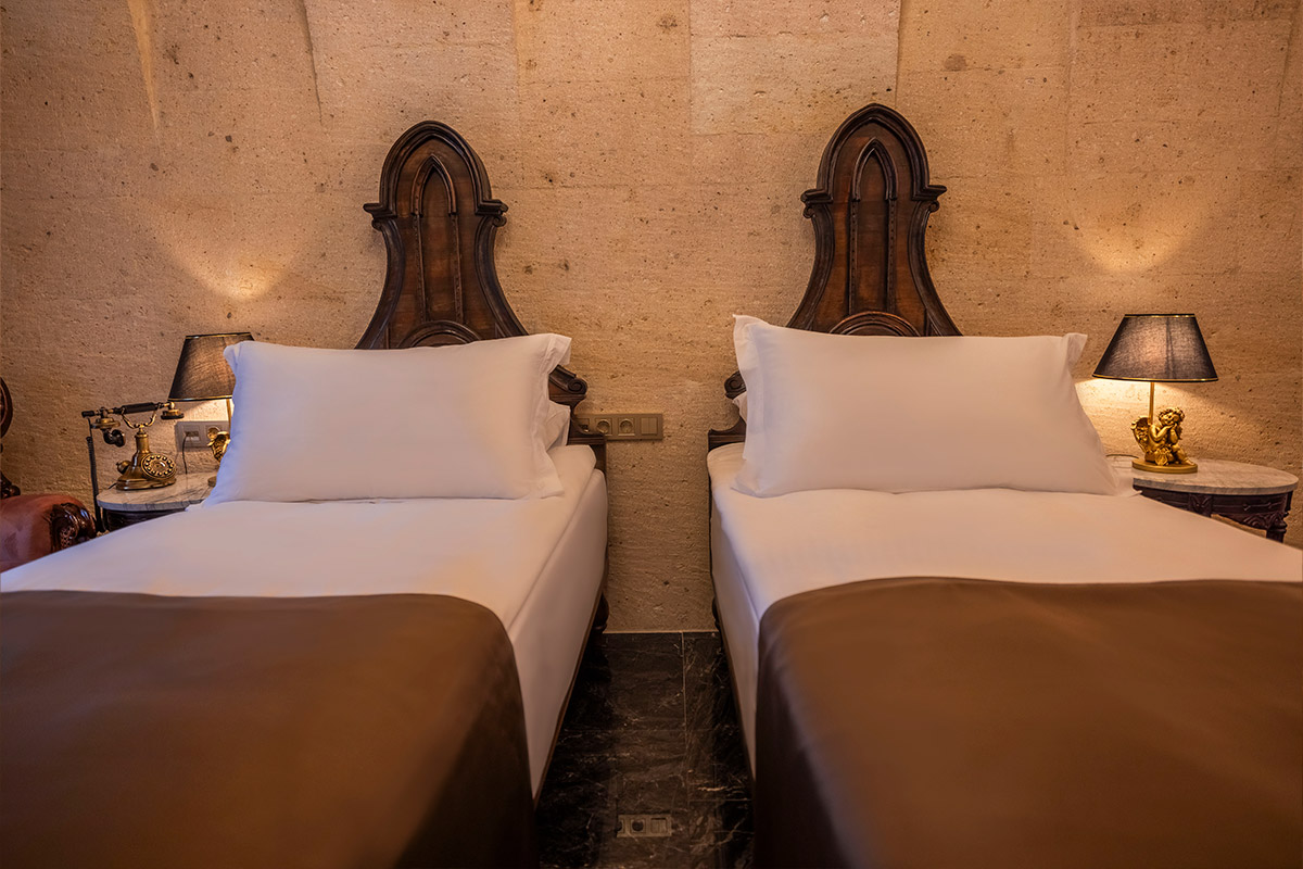 The well-appointed, non-smoking Deluxe Cave Suite features 1 twin or double bed with plush linens, artisanal carpets, and a private outdoor sitting area next to the courtyard. Modern essentials like free WiFi and a flat-screen HDTV keep you connected while the bathroom’s soothing walk-in shower, premium bath products, hair dryer, bathrobes, and slippers help you unwind. Additional amenities include a laptop-sized safe, desk, prayer mats, clothes hamper, sitting area, and air conditioning.